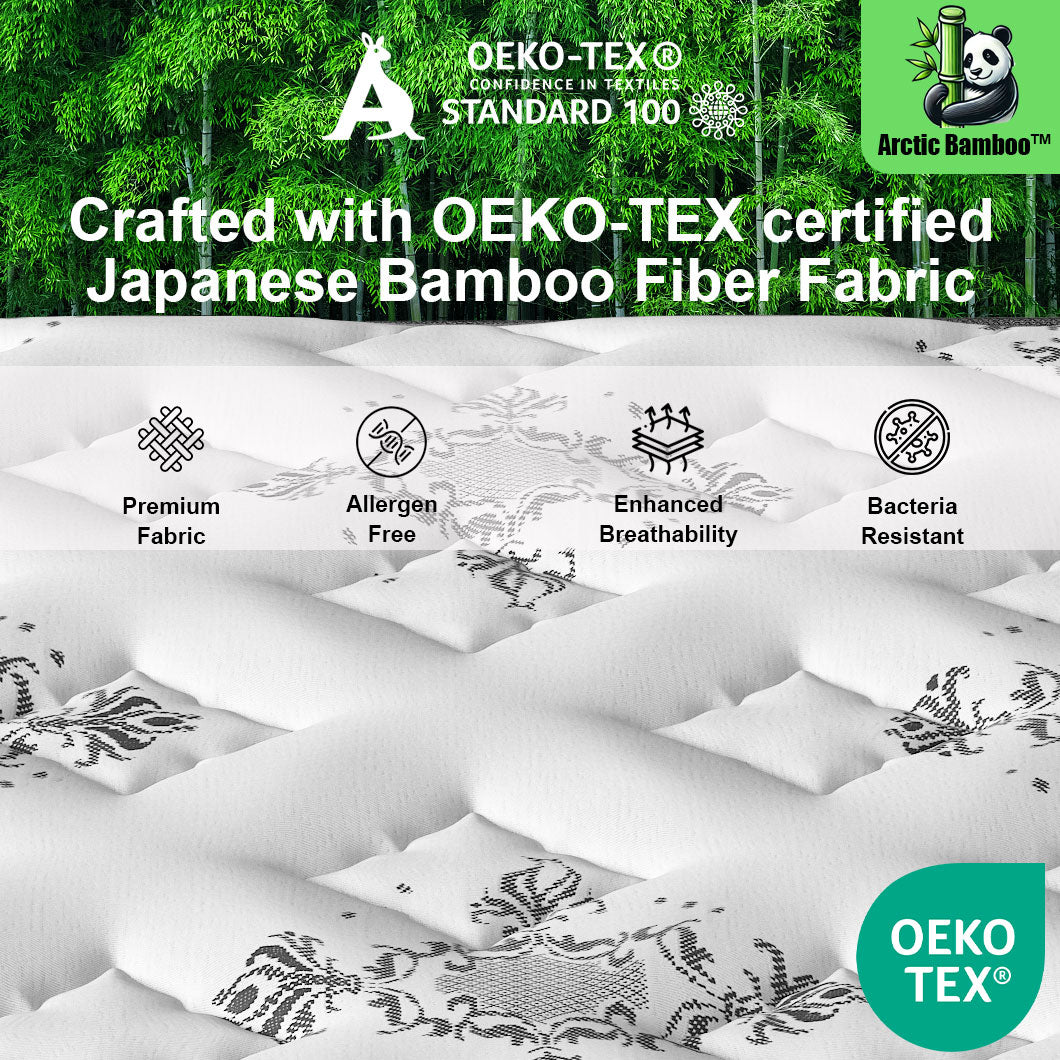 This mattress is crafted using Arctic Bamboo™ technology and features OEKO-TEX certified Japanese bamboo fiber fabric, a breakthrough in bamboo fiber innovation. By enhancing the natural properties of bamboo, Arctic Bamboo™ technology delivers superior breathability, moisture-wicking, and antibacterial performance, effectively repelling allergens and dust mites to create a clean and safe sleeping environment.