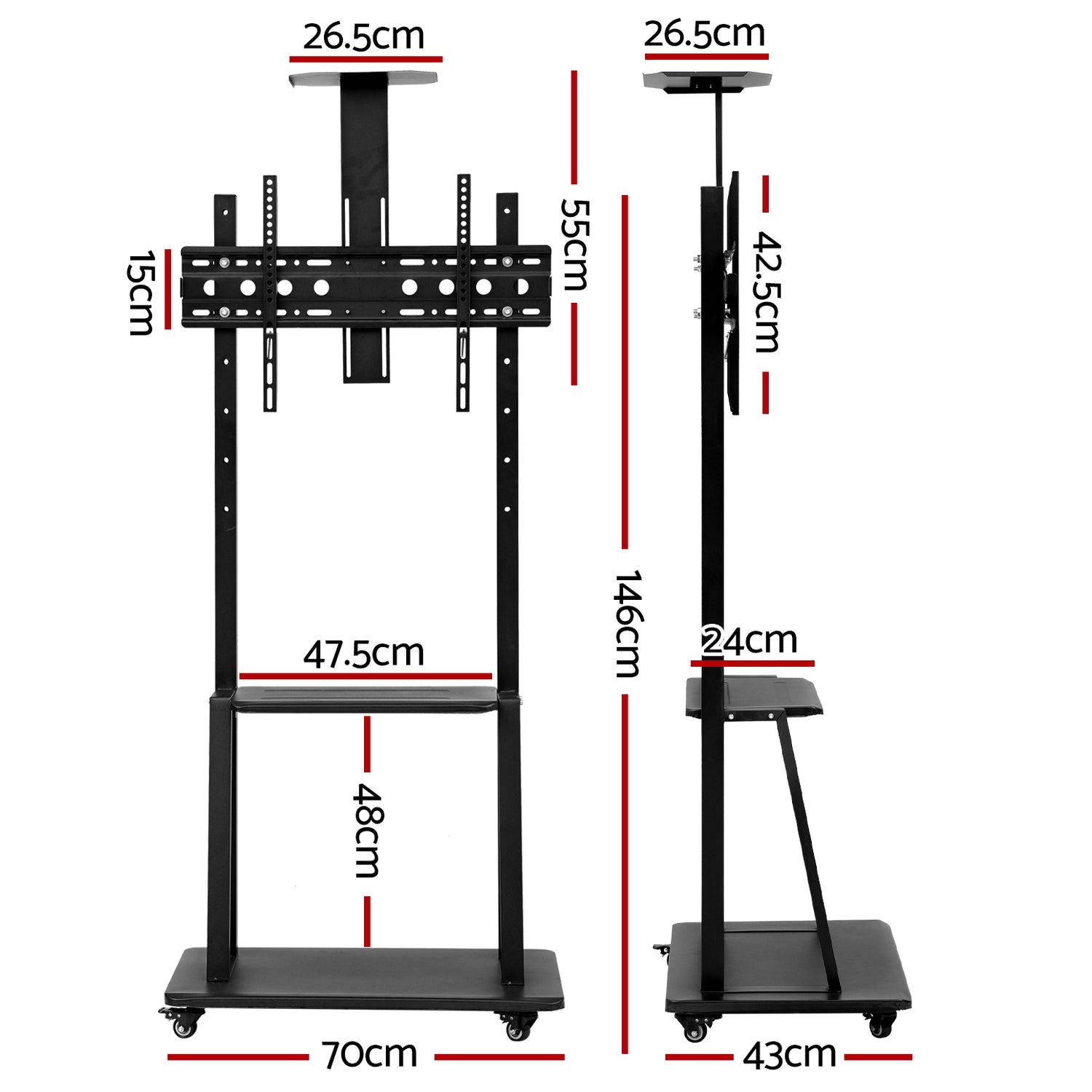 For reliable mobile entertainment, you'll love the Artiss Mobile TV Stand. Suitable for screens between 32-75" wide and with flexible VESA mounting options, our stand suits a variety of home televisions for your convenience. This stand is constructed from a high-quality steel frame with a sleek black powder-coated finish, ensuring durability and style. Adjust the height of your television to suit the occasion with three adjustable height levels. Equipped with four lockable castor wheels, the television can be wheeled from room to room with ease, making it perfect for homes, classrooms or offices. The stand also features a convenient top shelf and base storage for your media devices and accessories. With a safety bolt for secure fixing, rest assured your TV will stay secure throughout its use. Upgrade your viewing experience with the Artiss Mobile TV Stand today!