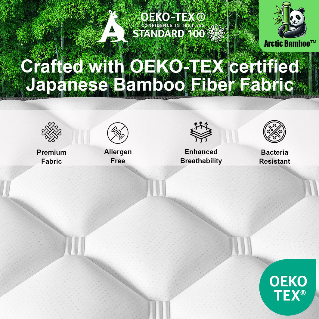 This mattress is crafted using Arctic Bamboo™ technology and features OEKO-TEX certified Japanese bamboo fiber fabric, enhancing bamboo’s natural properties for superior breathability, moisture-wicking, and antibacterial performance. It effectively repels allergens and dust mites, ensuring a clean and safe sleeping environment.