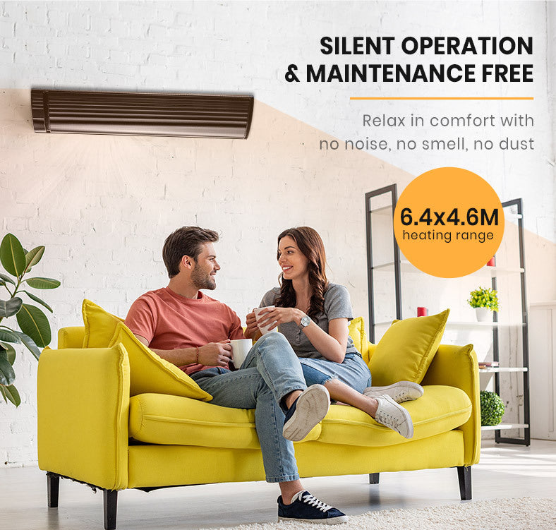 For each heater, a 2400 watt electric element is embedded in the black anodised aluminium strip that rapidly produces even and gentle heat dispersion. Plus, unlike gas heaters there is no glow or glare, and no need to refuel.