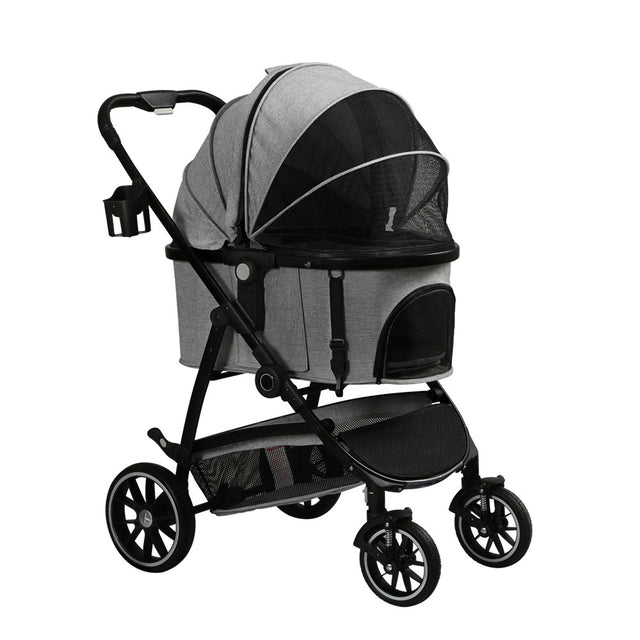 i.Pet's pet stroller is perfect to take your furry friend on strolls, especially if you're planning to take those slightly longer strolls that can get you sweating. Or it's a great accessory if your pet is suffering from mobility issues but wants to get outdoors. Featuring a spacious interior, our pet stroller can be used as a stroller, carrier, and car seat. It has adjustable front veil for UV protection, and the mesh window offers good visibility and allows proper airflow as you take your pet for a stroll. This pet stroller is made from high-quality 600D oxford and linen fabric with durable aluminium alloy frame and 3D PU wheels that ensures sturdiness and durability for longlasting use. It comes with 360˚ rotatable front wheels and lockable rear wheels for smooth movement and safety, and the built-in safety belt keeps your pets safe. Our pet stroller is quite spacious that ensures your pet's comfort and comes with a removable cushion for additional support. It also has a large storage basket underneath that offers ample space to store nitty-gritty stuff. Furthermore, this water-resistant pet stroller is easy to install and features a one-step fold mechanism that allows easy storage, and the foam handle makes it extremely comfortable for you as you tour them at the park or around the neighbourhood. Without any hesitation, shop our reliable and durable i.Pet's pet stroller for your furry companions.