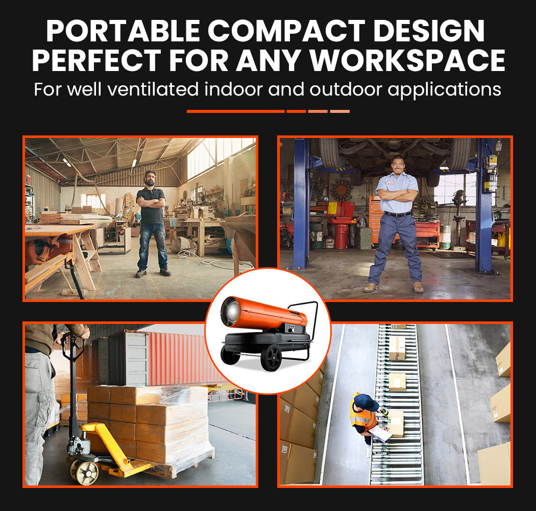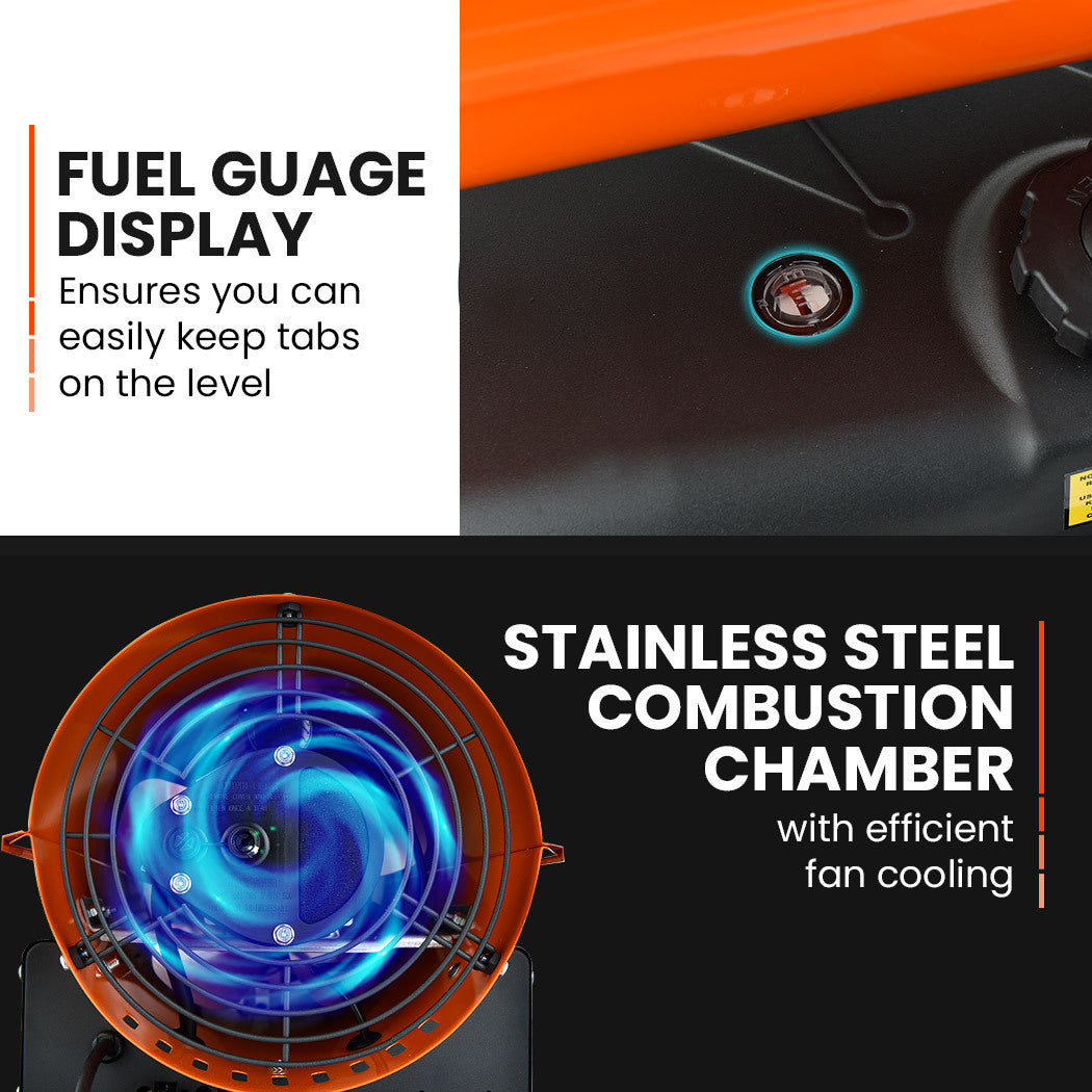 Importantly, this Portable Blow Heater is an exceedingly safe unit to have functioning in busy environments. It has built-in features which protect against overheating, flame-outs and electrical power breakdowns. Moreover, it operates on both Diesel and Kerosene fuel for greater versatility.